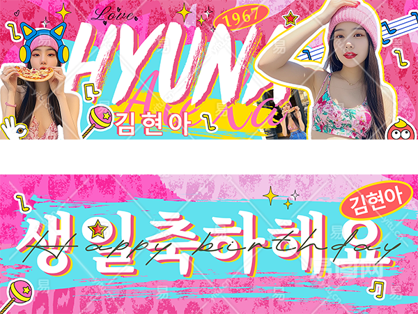 当前的位置:首页 > 广告设计 > 海报 > 手幅 > 粉蓝撞色拼贴分韩国娱乐明星泫雅生日应援粉丝团手幅粉丝应援