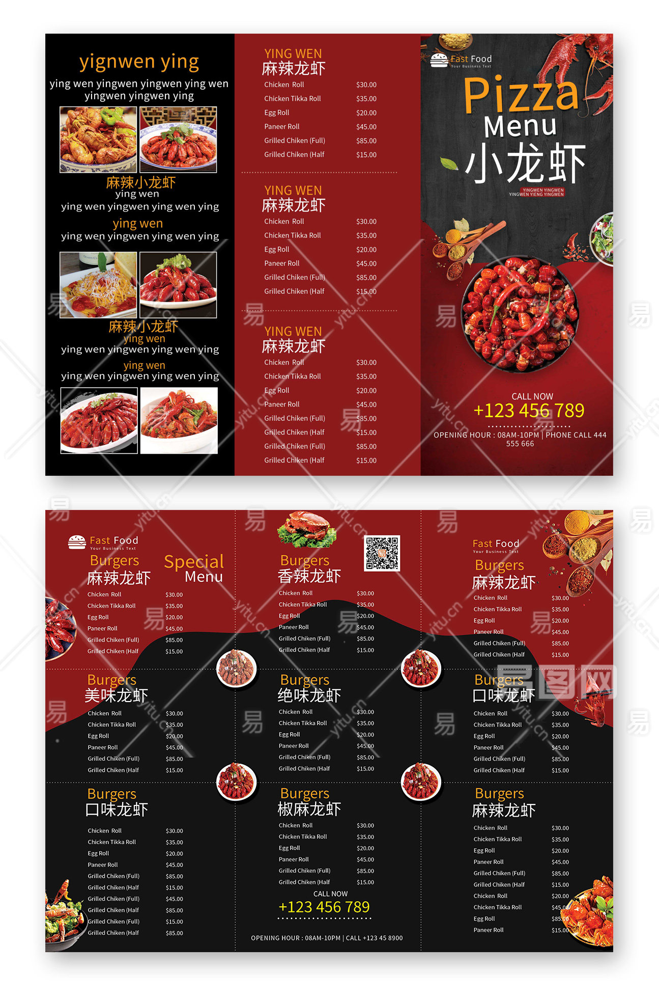 美食餐厅餐饮餐饮红色背景小龙虾菜单三折页