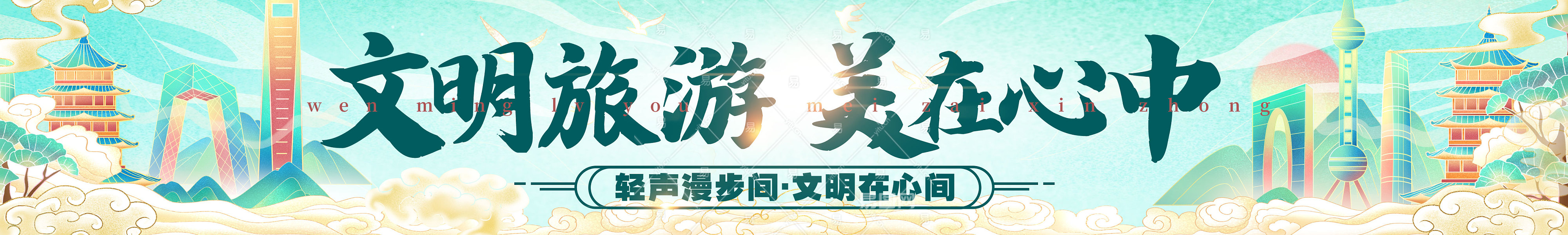 浅青色国潮风文明旅游文明出行宣传横幅条幅背景
