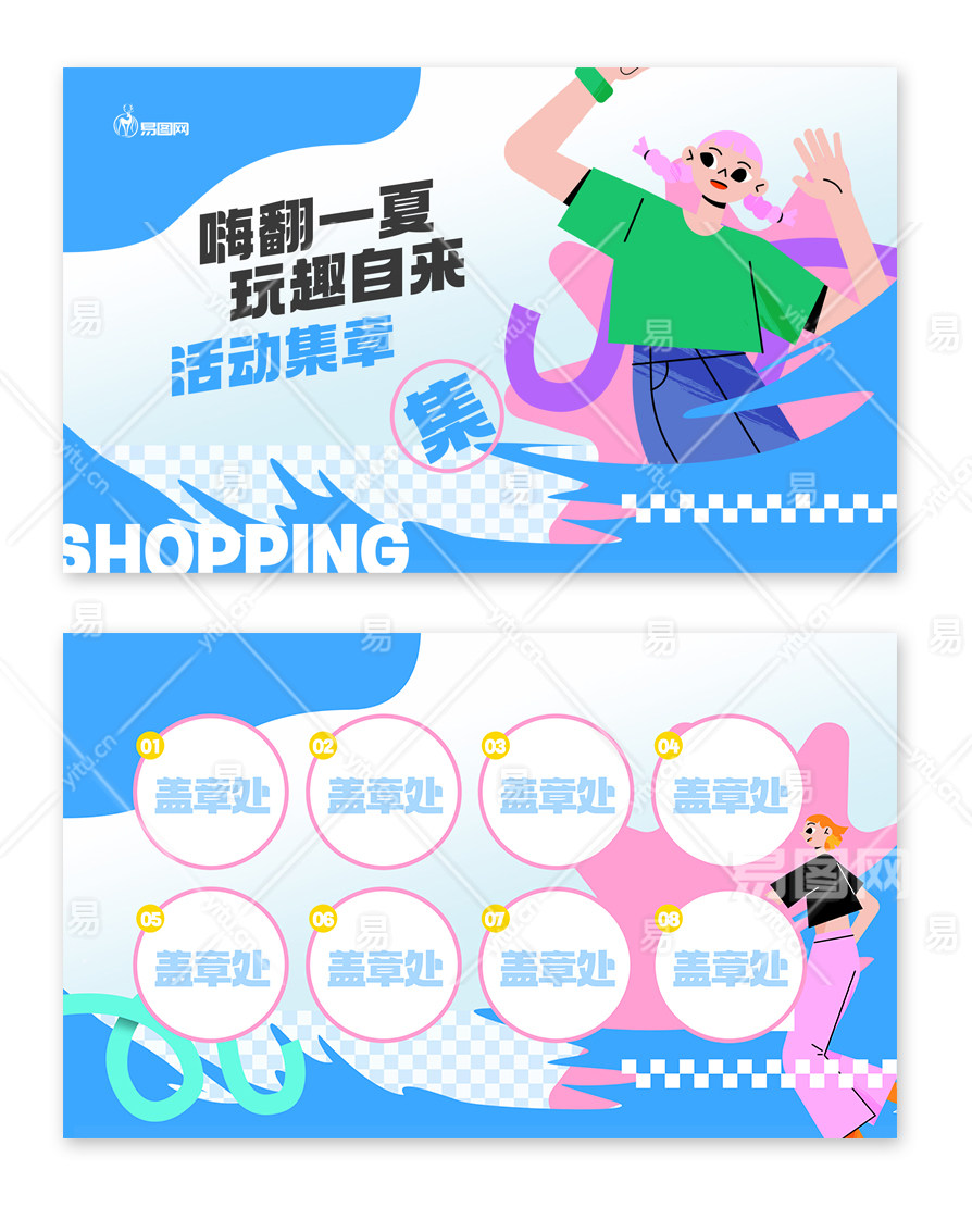 当前的位置:首页 > 广告设计 > 名片/卡证 > 其它 > 白蓝扁平插画风夏日商场活动打卡明信片