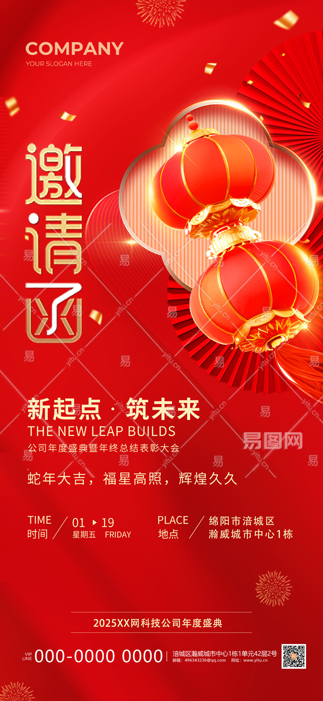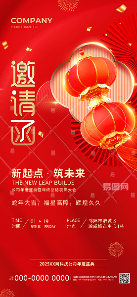 红色简约大气2025蛇年年会活动会议邀请函手机文案海报年会邀请函