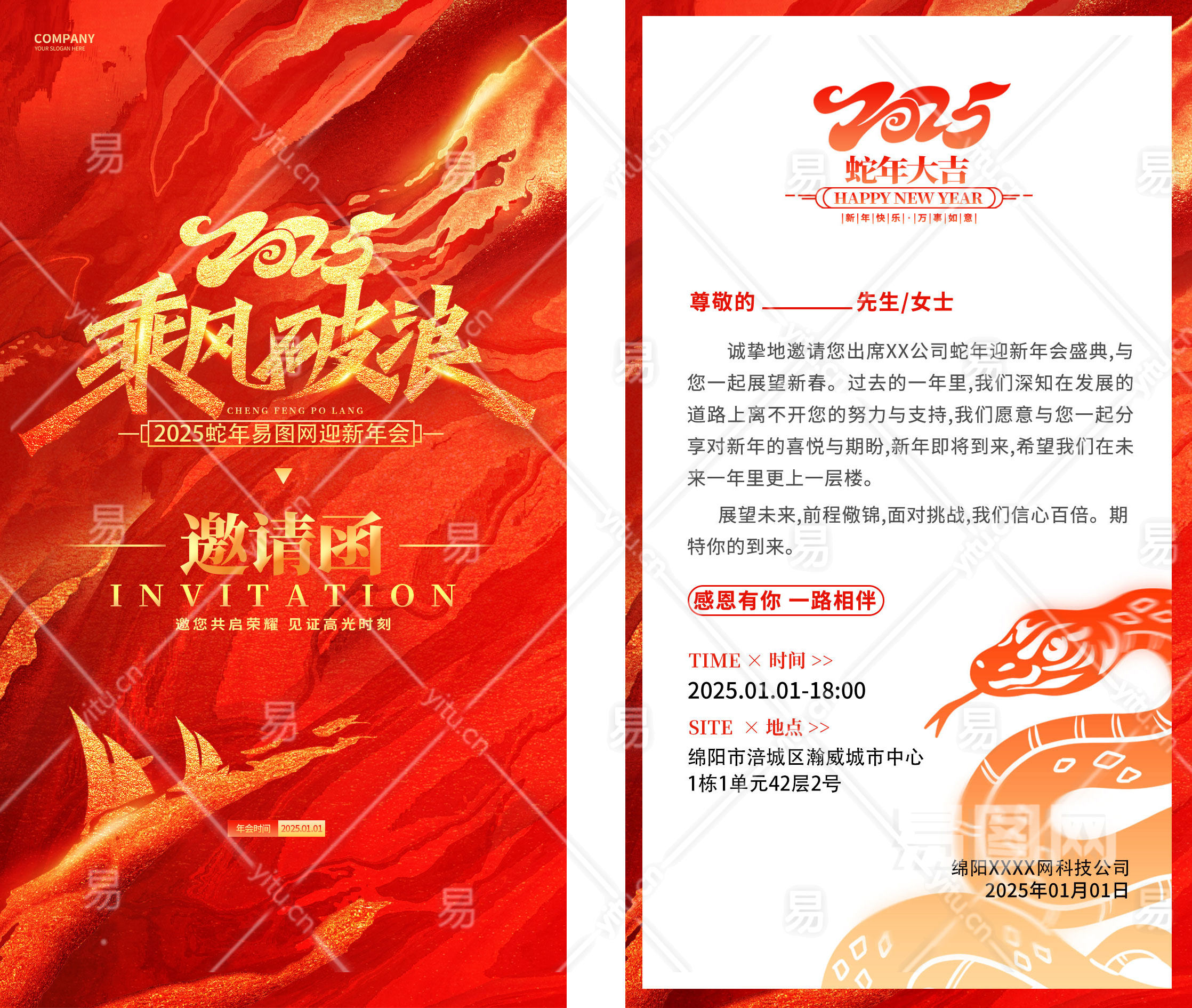 红色烫金风2025蛇年企业年会迎新年会邀请函2025年会