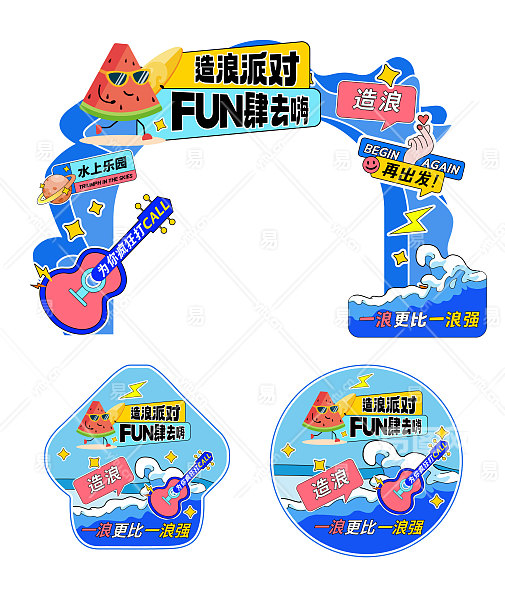 蓝色黄色黑描边风水上乐园造浪门头地贴图片模板