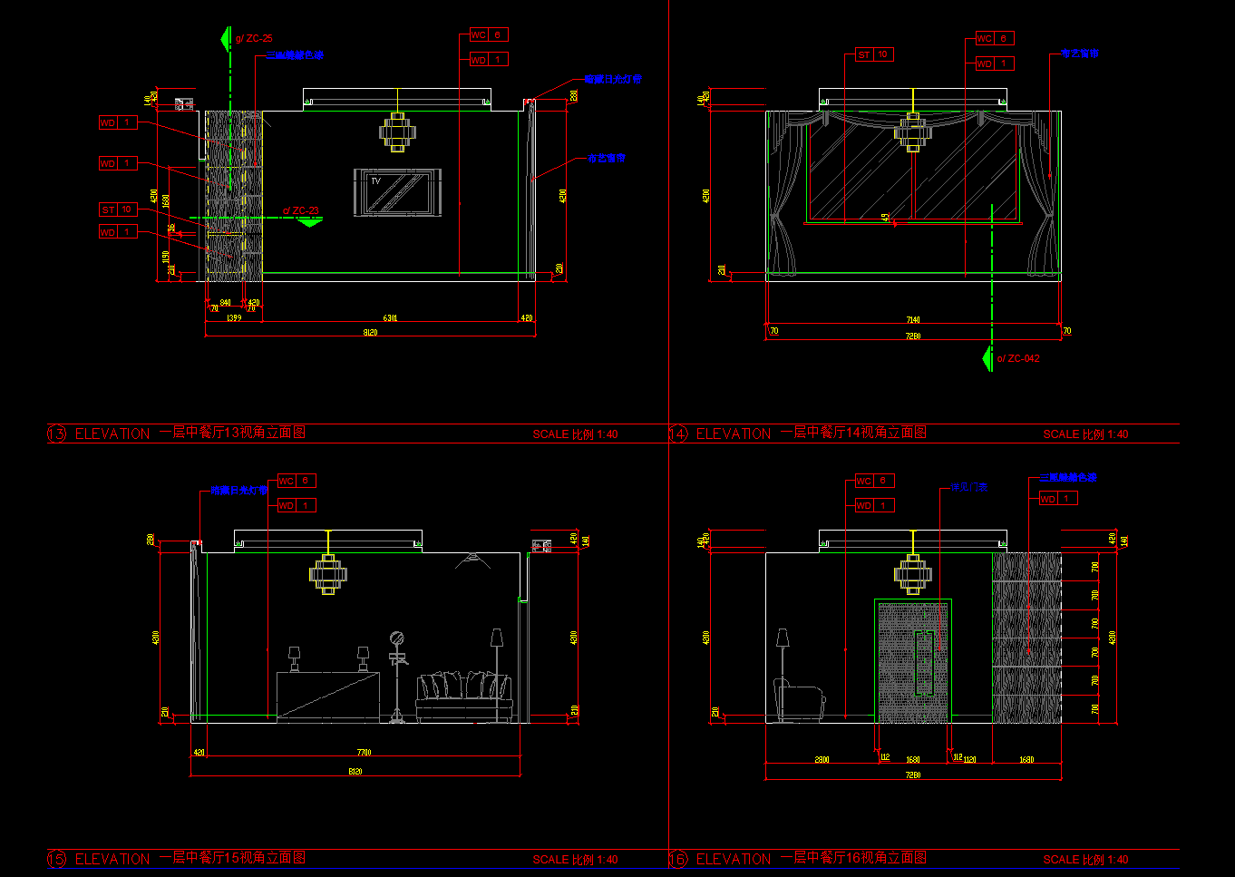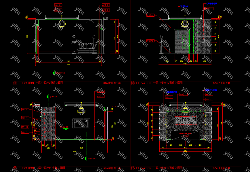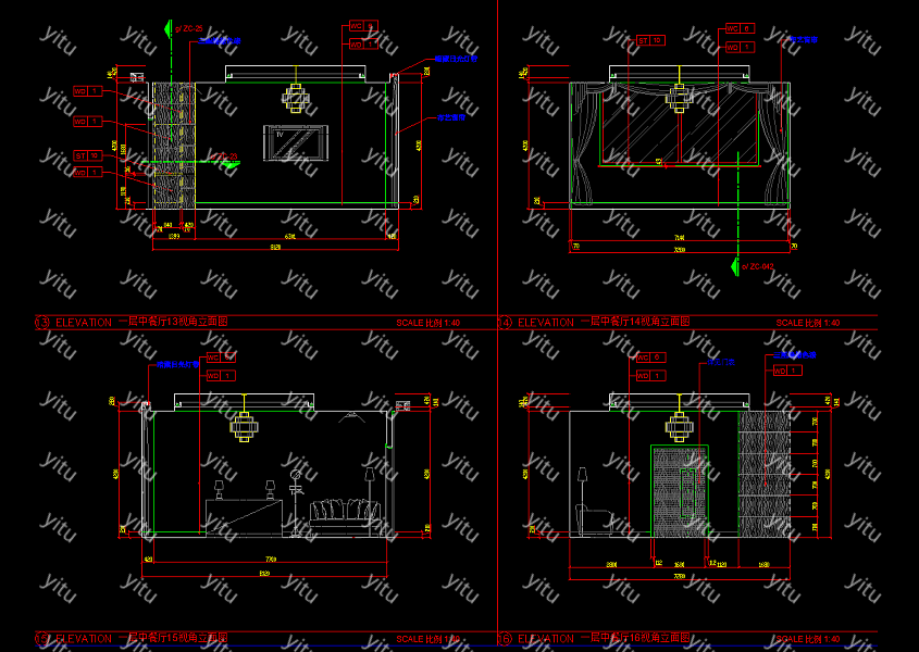 资料内容包括:全套中餐厅施工图,一层中餐厅平面布置图,一层中餐厅墙体定位图,一层中餐厅剖面大样图,一层中餐厅视觉立面图,一层中餐厅立面索引图,一层中餐厅灯具布置图,一层中餐厅面材料图,一层中餐厅吊顶布置图,一层中餐厅吊顶局部大样图,中餐厅采用现代的风格进行设计空间设计合理,内容详实,图纸中无错漏碰缺。作图规范,具有较高的参考价值,可供设计师参考。