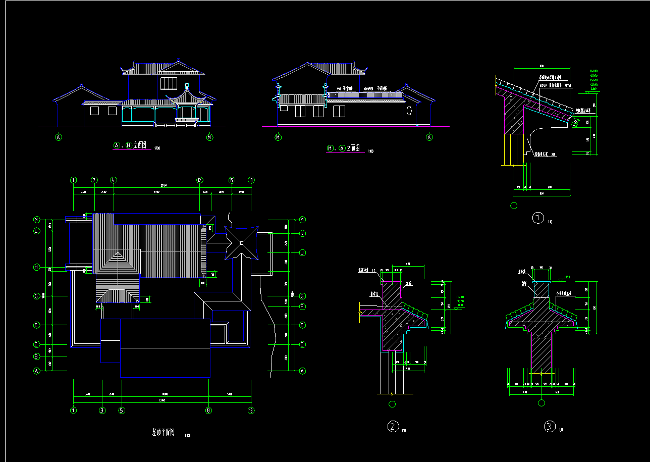 三套古建别墅建筑图,别墅CAD建筑图纸下载内容简介:图纸包含别墅建筑平面图、立面图、剖面图、节点大样图等,作图规范,内容详实,可供参考。