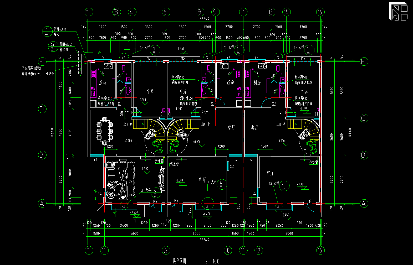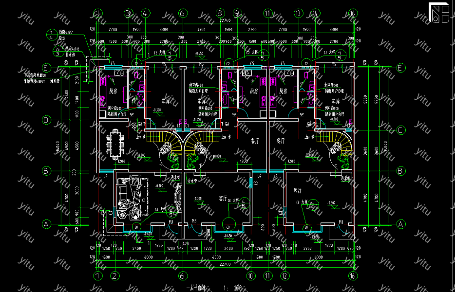 民居式联排别墅施工图,别墅CAD建筑图纸下载