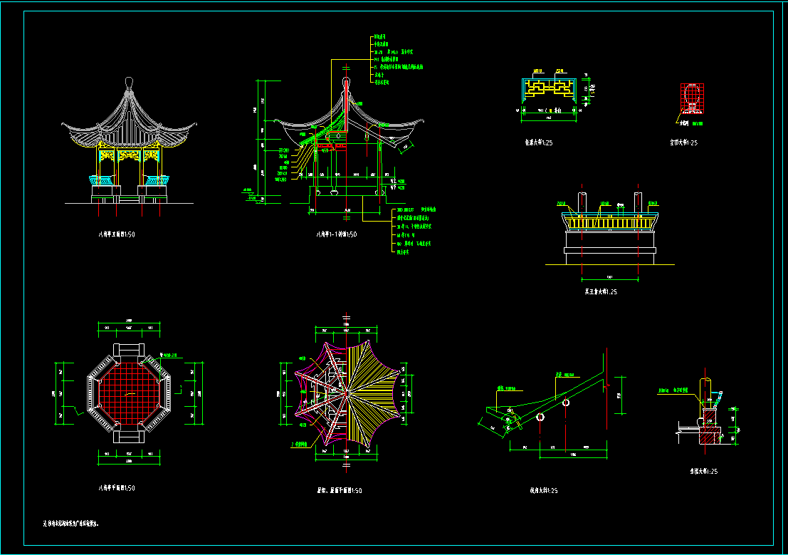 古建亭子cad施工图集,景观亭cad竣工图下载