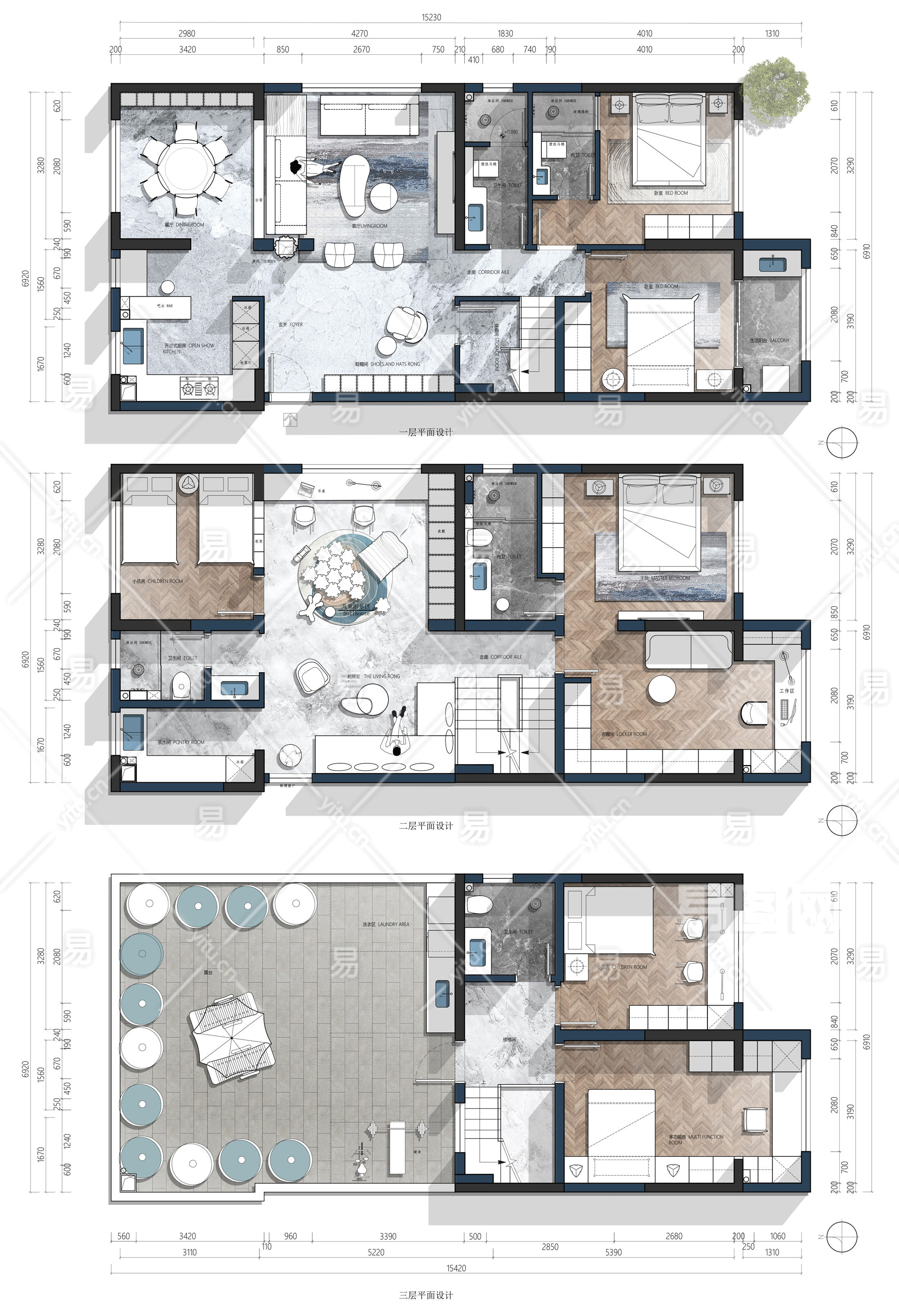【CAD图纸】三层复式CAD平面设计方案+PSD彩平