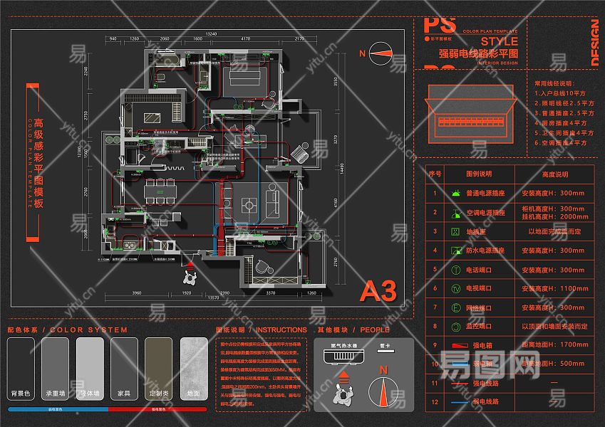【CAD图纸】强弱电水路PS彩平图模版