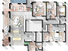 【CAD图纸】500㎡三居室大平层CAD平面方案+PSD彩平