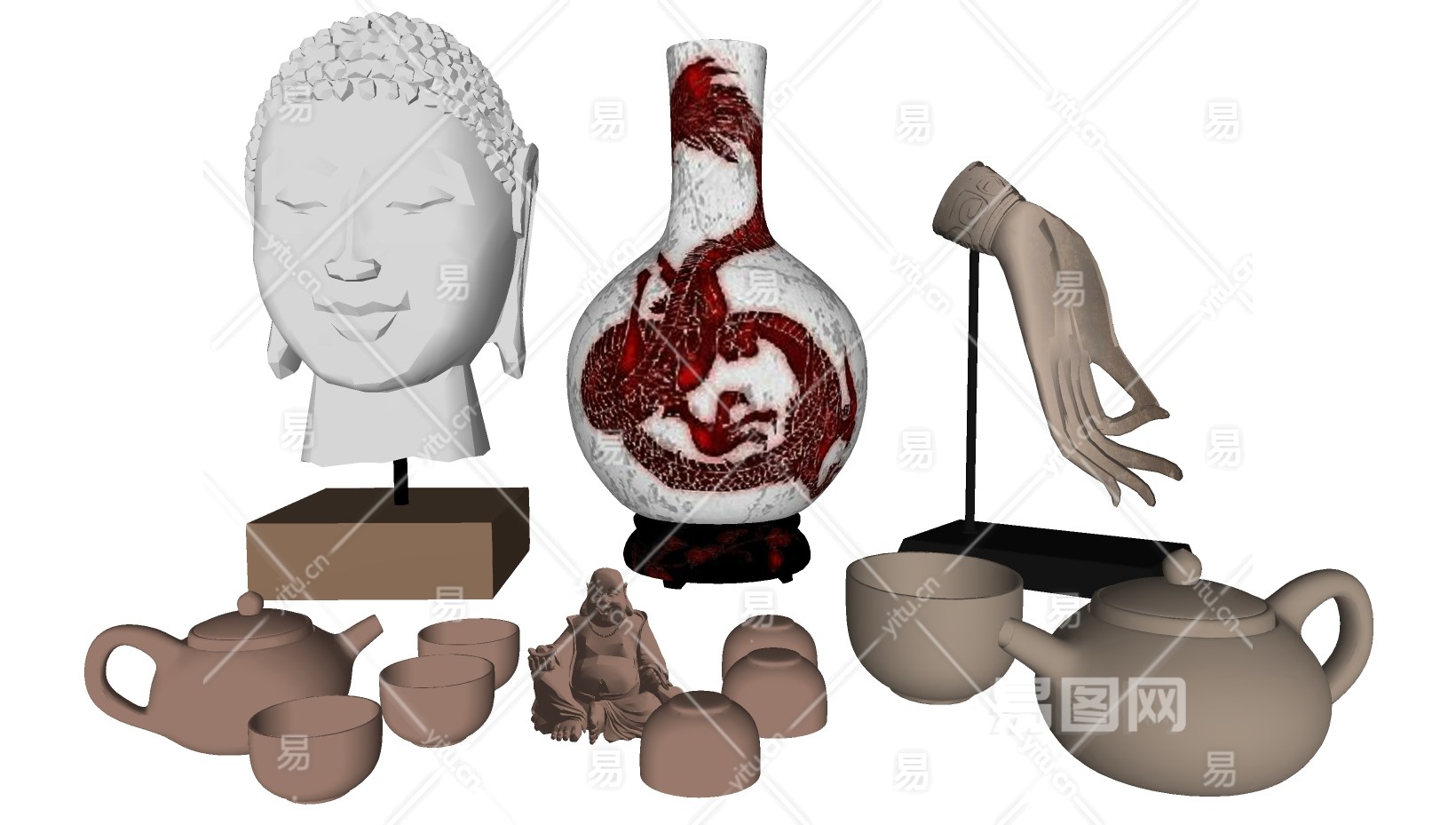 新中式茶具摆件 茶壶水壶水杯 su草图模型下载