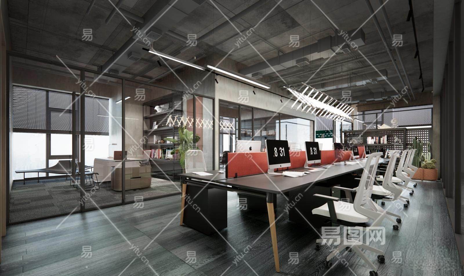 工业风办公室 玻璃会议桌 货物架 马扎灯