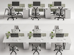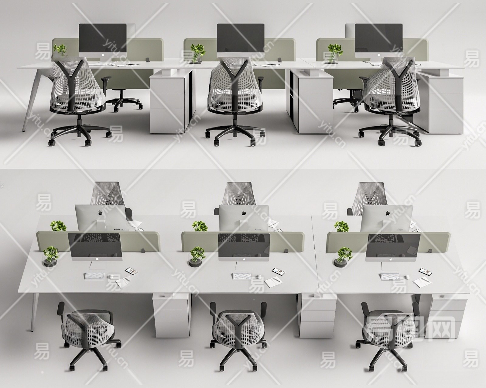 现代办公桌椅组合 办公桌 办公卡位 员工位 办公椅 苹果电脑 文件柜 公共办公区