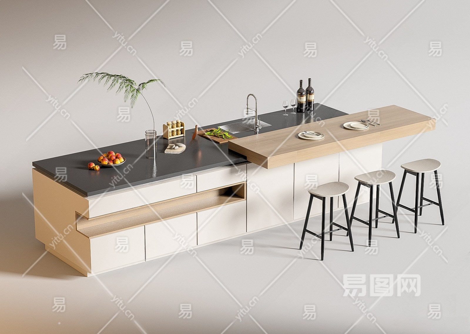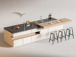 现代西厨吧台 中岛台 水槽 吧椅 室内
