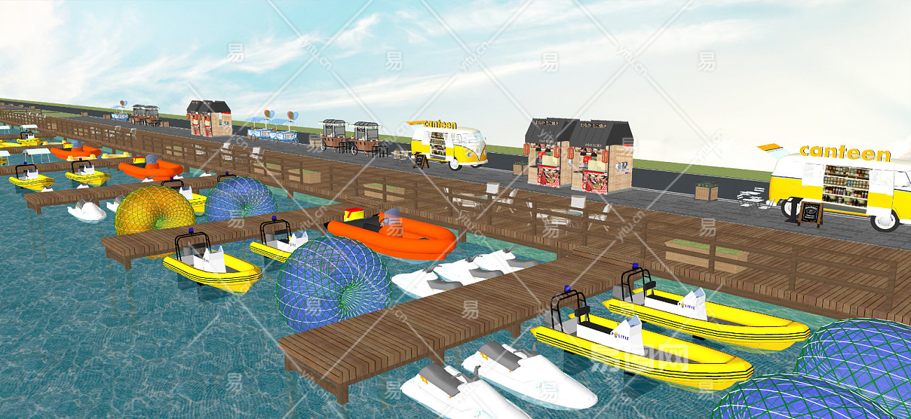 现代滨河湿地公园 水上娱乐设施 亲水平台 码头 快艇 小船 售卖亭 快餐车