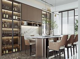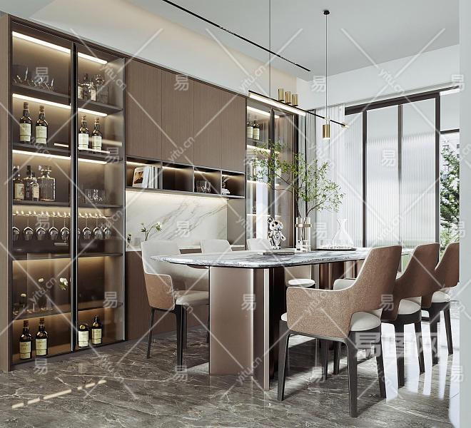 现代轻奢餐厅 餐桌椅 餐椅 长方形餐桌 单椅 酒柜 吊灯 橱柜
