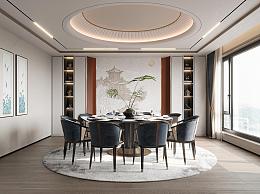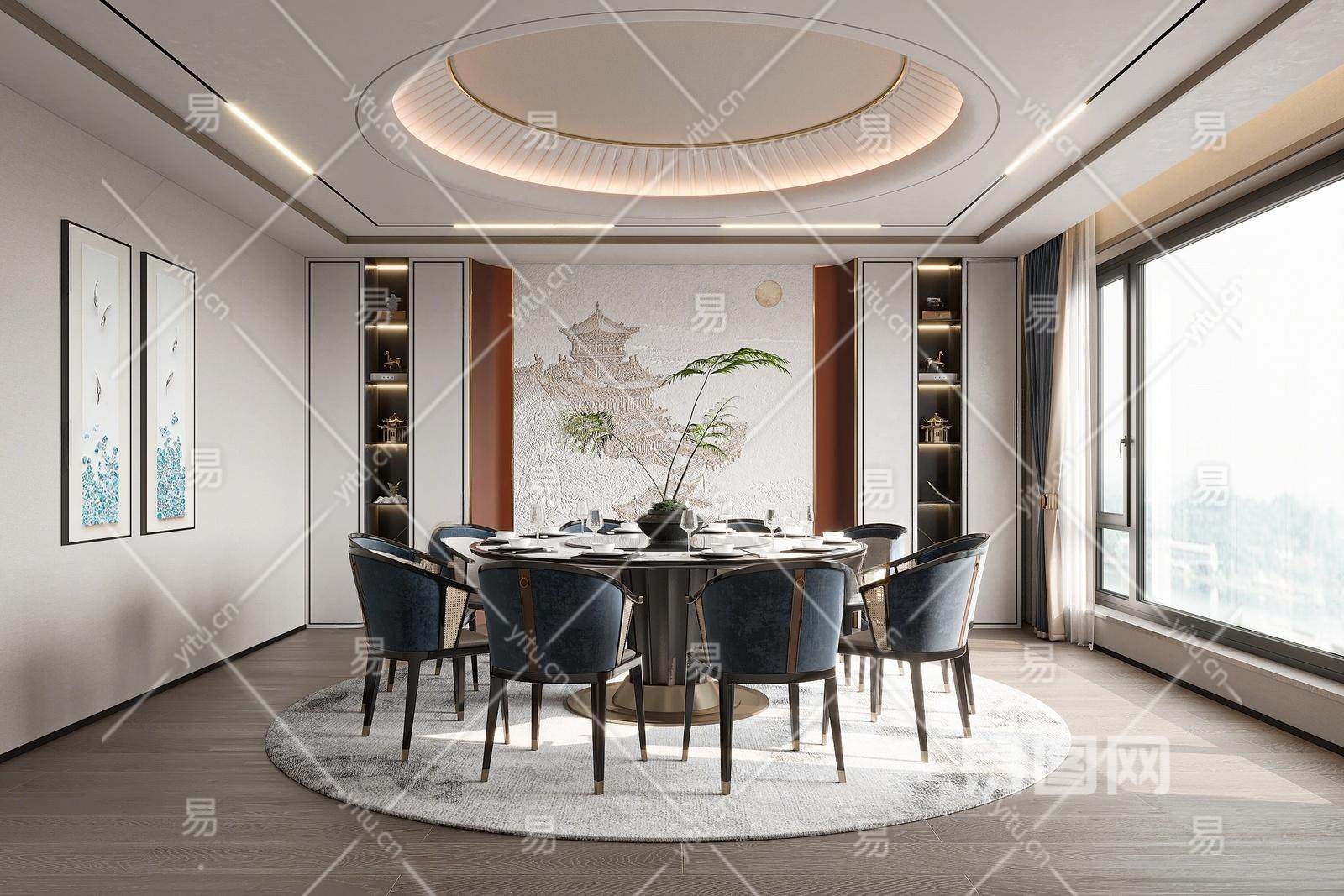 新中式包厢 餐厅 餐桌椅 餐椅 单椅 地毯 圆形餐桌 餐具 背景墙
