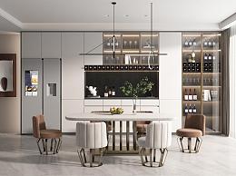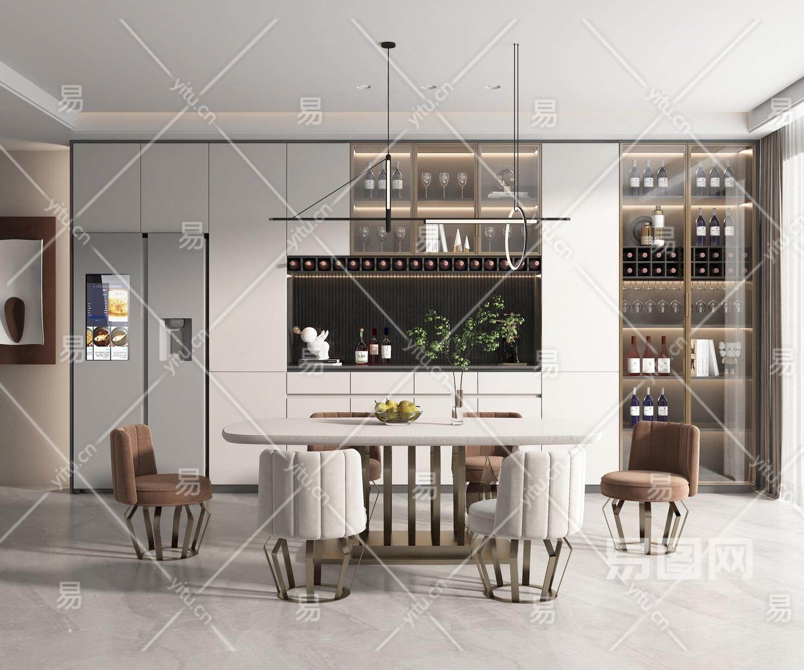 现代家居餐厅 餐桌椅 餐桌椅组合 餐椅 吊灯 背景墙 装饰柜 挂画 书柜