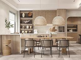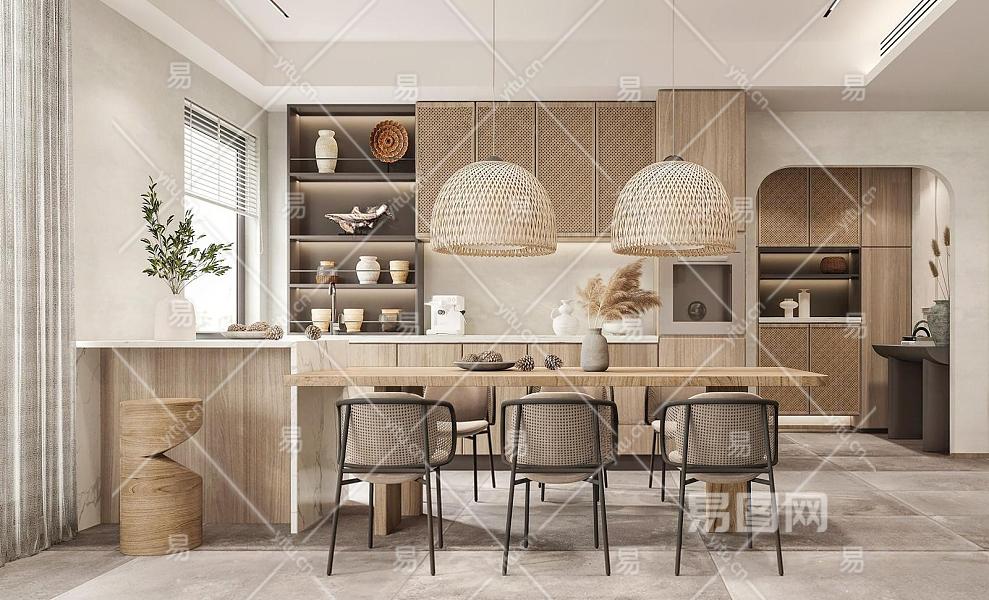 侘寂家居吧台区 餐厅 餐桌椅 吊灯 酒柜 装饰摆件