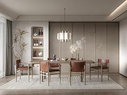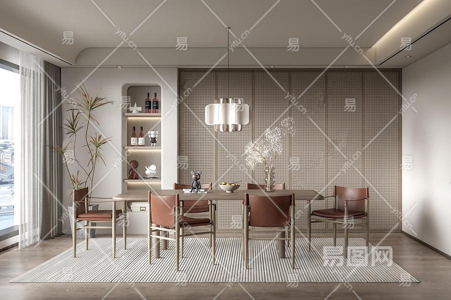侘寂家居餐厅 餐桌椅组合 吊灯 绿植盆栽 实木餐桌 藤编柜子