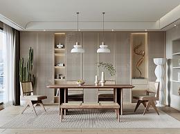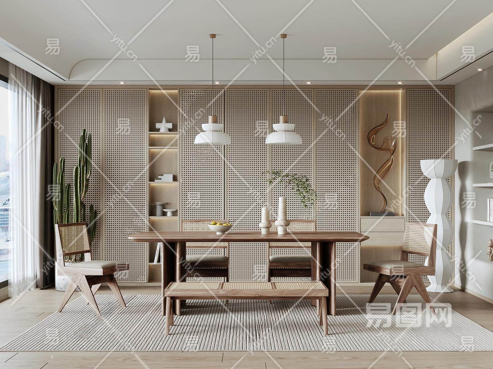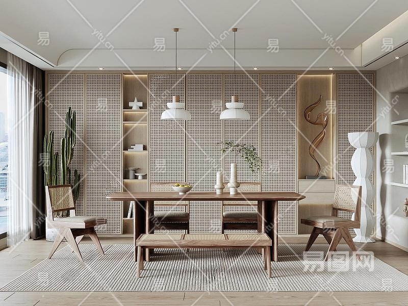 侘寂餐厅 实木餐桌 实木餐椅 吊灯 落地灯 绿植 装饰柜