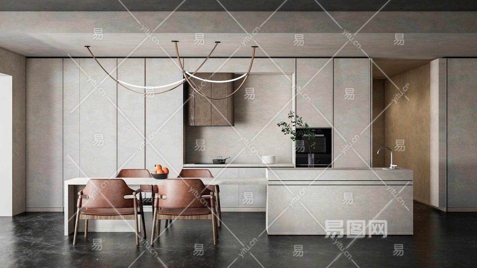 侘寂餐厅 餐桌椅 厨房 橱柜 岛台 吊灯 花瓶 厨房用品 烤箱
