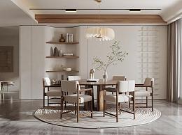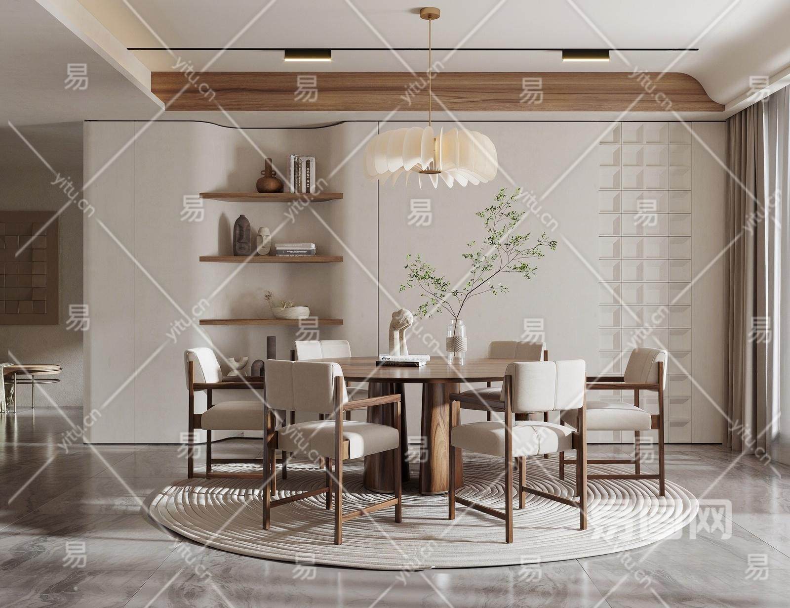 侘寂餐厅 餐桌椅 圆形餐桌 吊灯 壁柜 装饰摆件 饰品摆件 圆形地毯