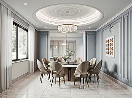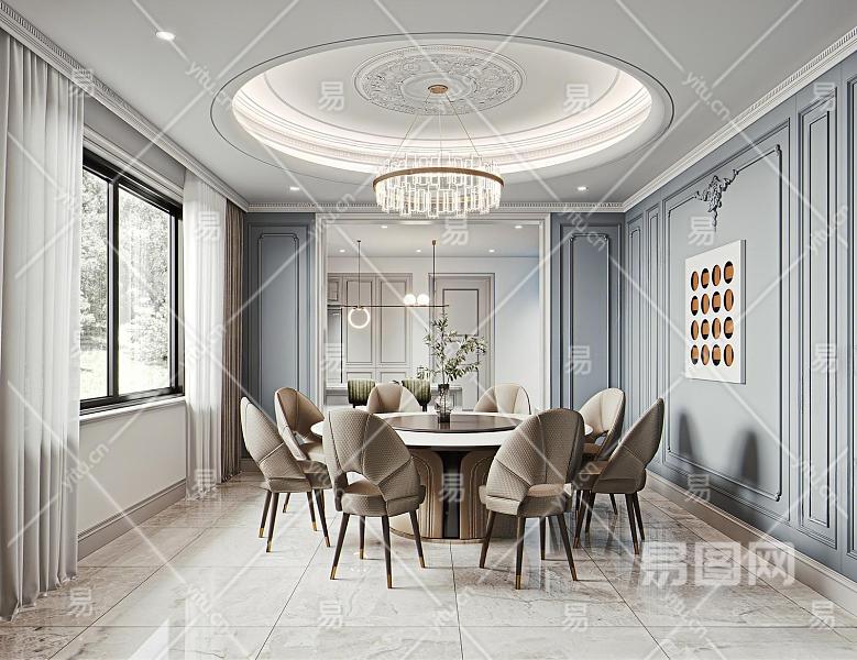 欧式餐厅 石质餐桌椅 金属吊灯 装饰摆件 绒布单椅 装饰挂画