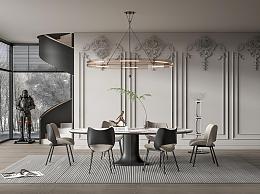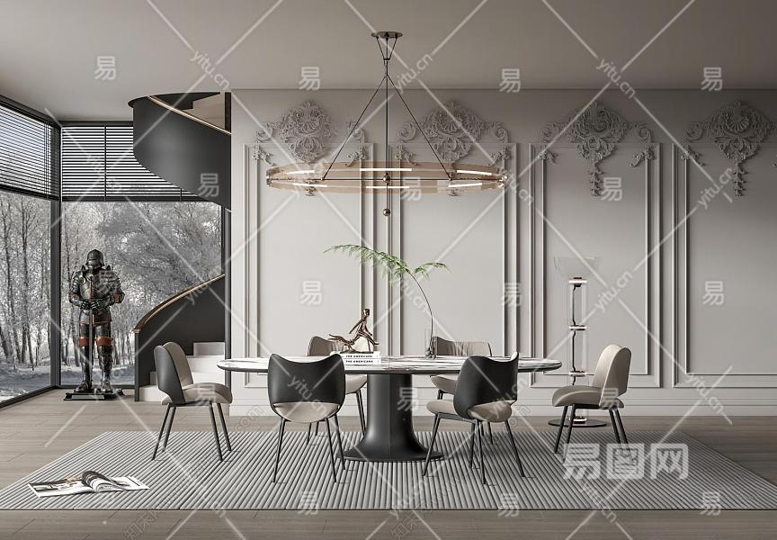 法式餐厅 餐桌椅 吊灯 旋转楼梯 雕塑摆件 雕花护墙板