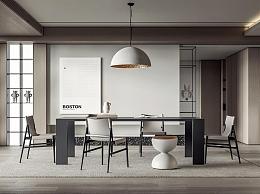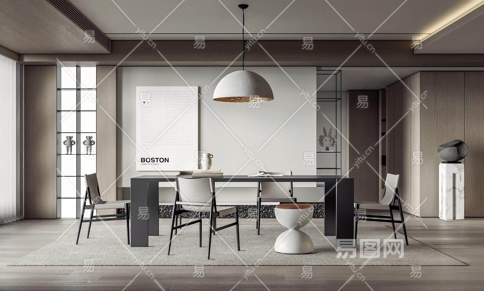 现代餐厅 餐桌椅组合 吊灯 挂画 装饰架 雕塑 地毯 梦幻帘 过道 矮凳