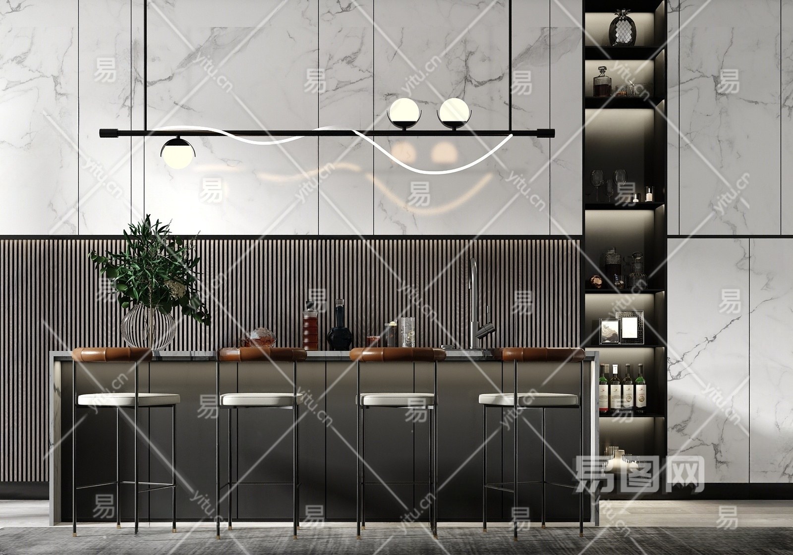 现代吧台区 吧台 吧椅 酒具组合