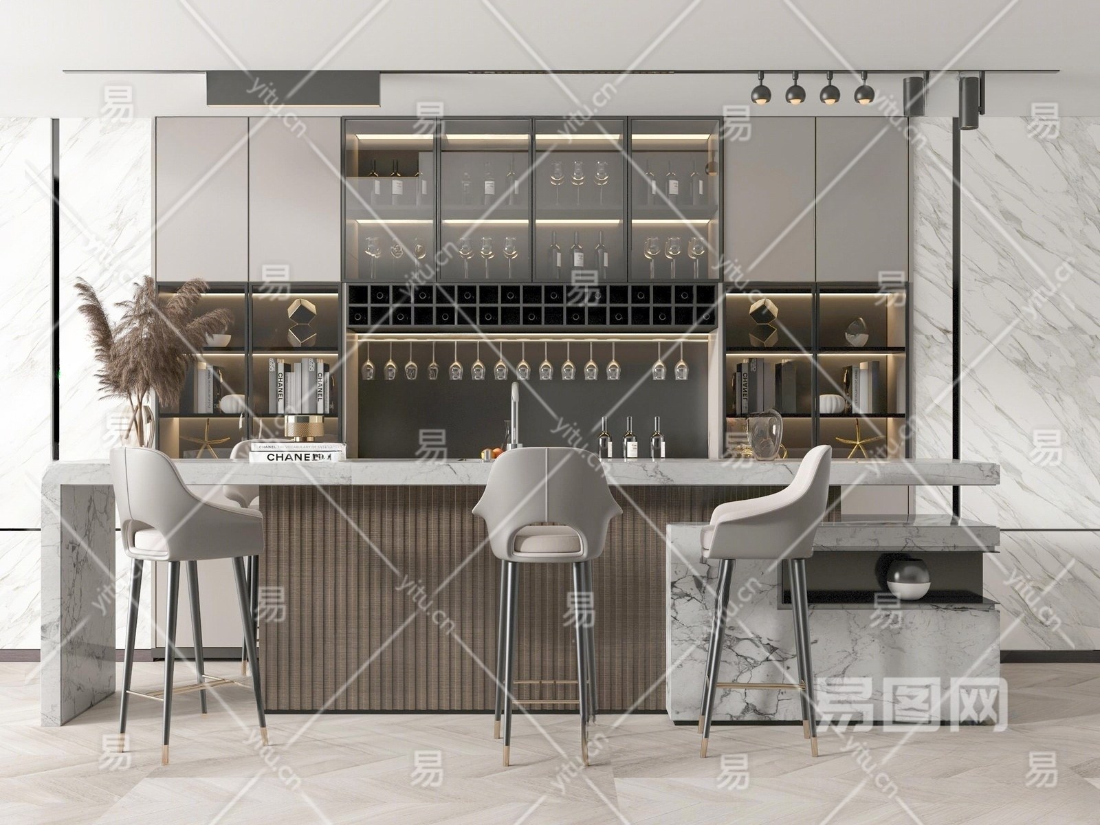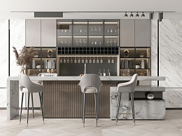 现代吧台区 吧台椅 酒柜组合 酒瓶 酒杯 摆件 酒吧台