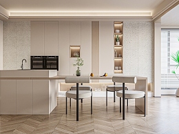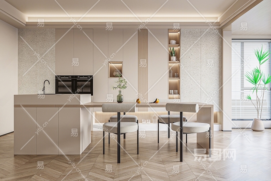 现代家居吧台区 实木餐桌岛台 单椅餐椅 装饰柜