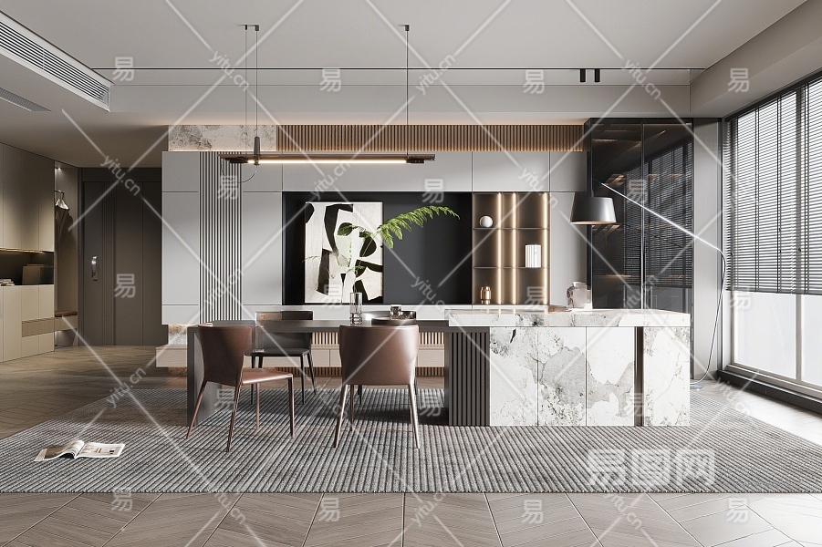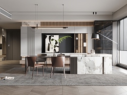 现代家居吧台区 餐桌椅 日式餐厅 画 落地灯 电视墙