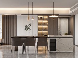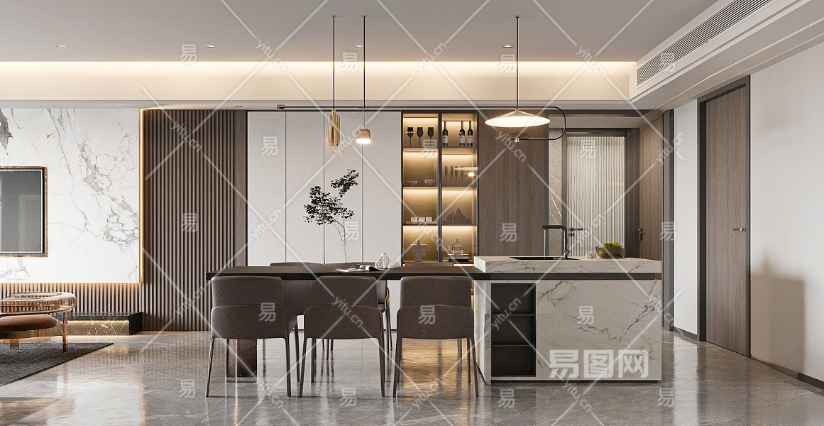 现代家居吧台区 餐桌椅 餐椅 中岛台 酒柜 岛台 吊灯 单椅
