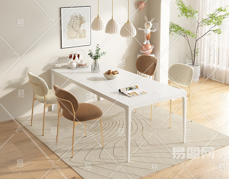 现代奶油风餐桌椅组合 餐厅 布艺金属餐椅 花瓶盆栽 玩偶雕塑 吊灯 果盘