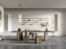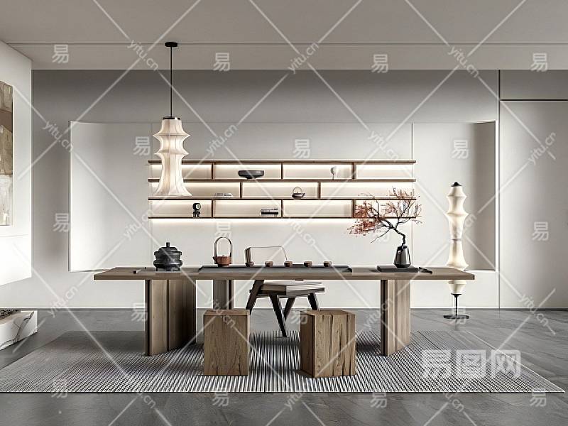 侘寂茶室茶桌椅组合实木矮凳雕塑摆件落地灯吊灯微水泥壁炉SU模型