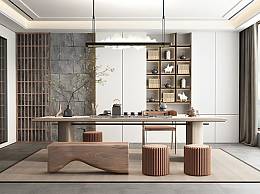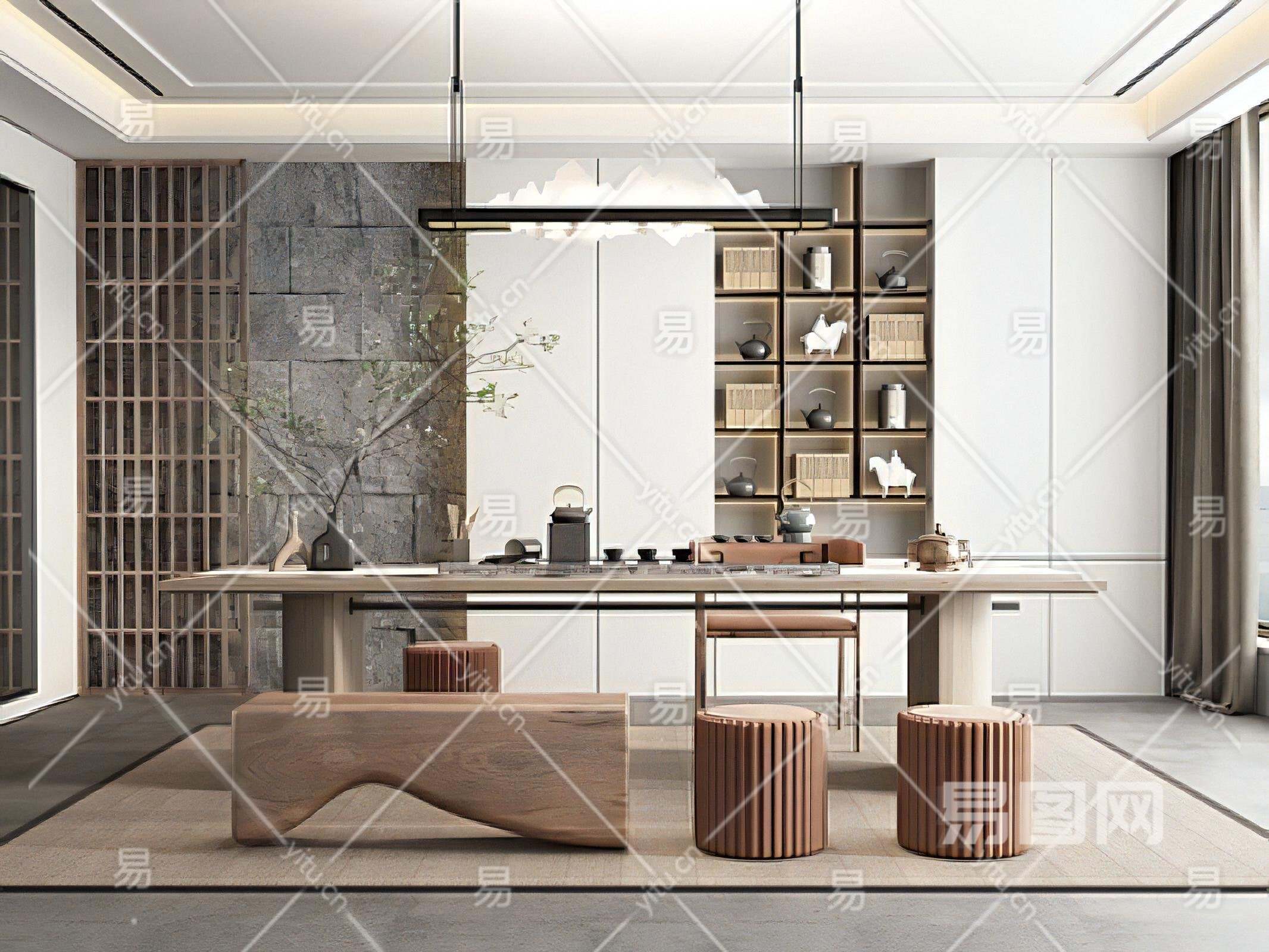 新中式茶室茶桌椅吊灯长凳凳子书柜茶具饰品摆件摆件SU模型