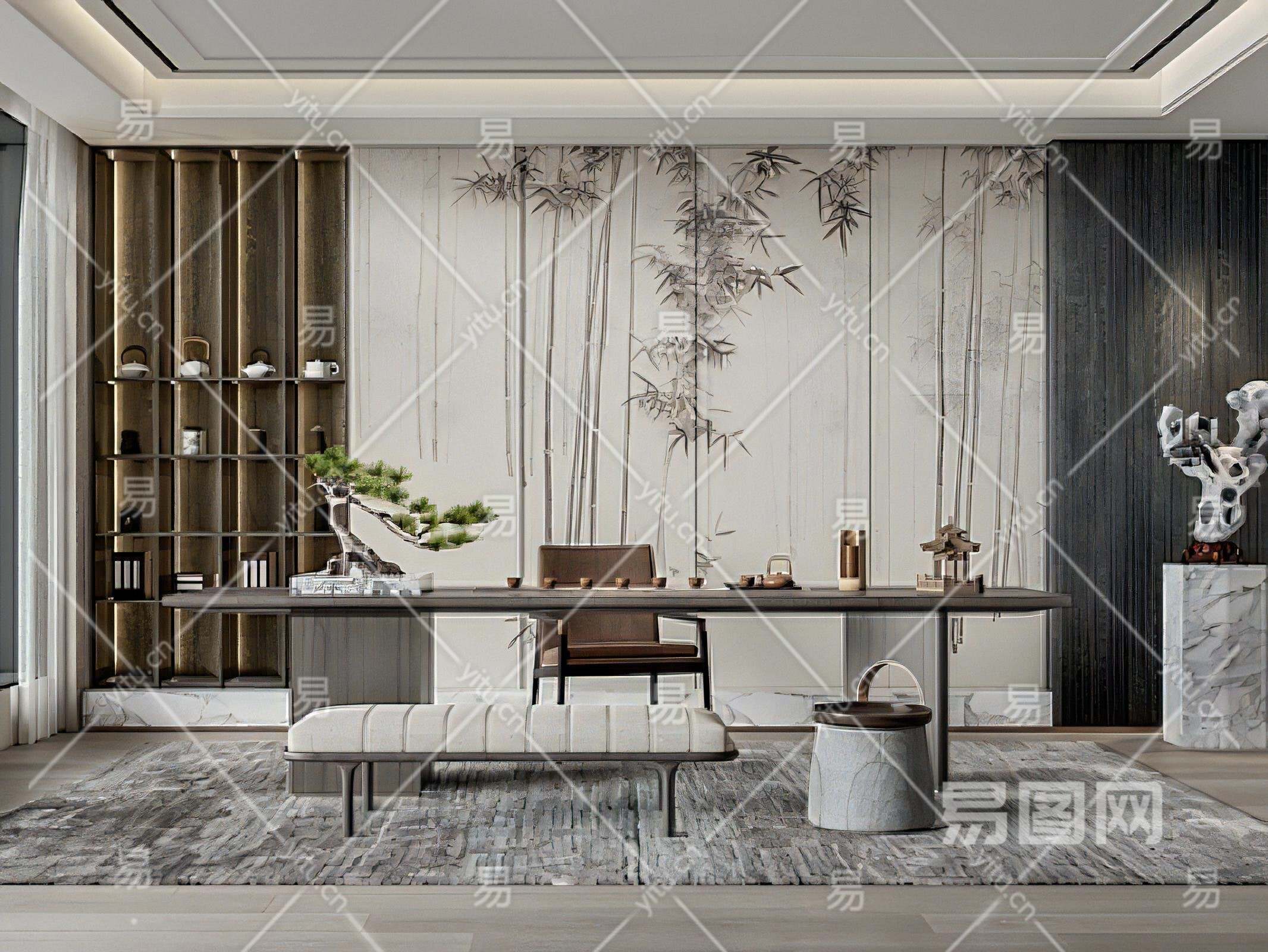 新中式茶室茶桌椅组合雕塑摆柜茶具盆景背景墙长凳SU模型