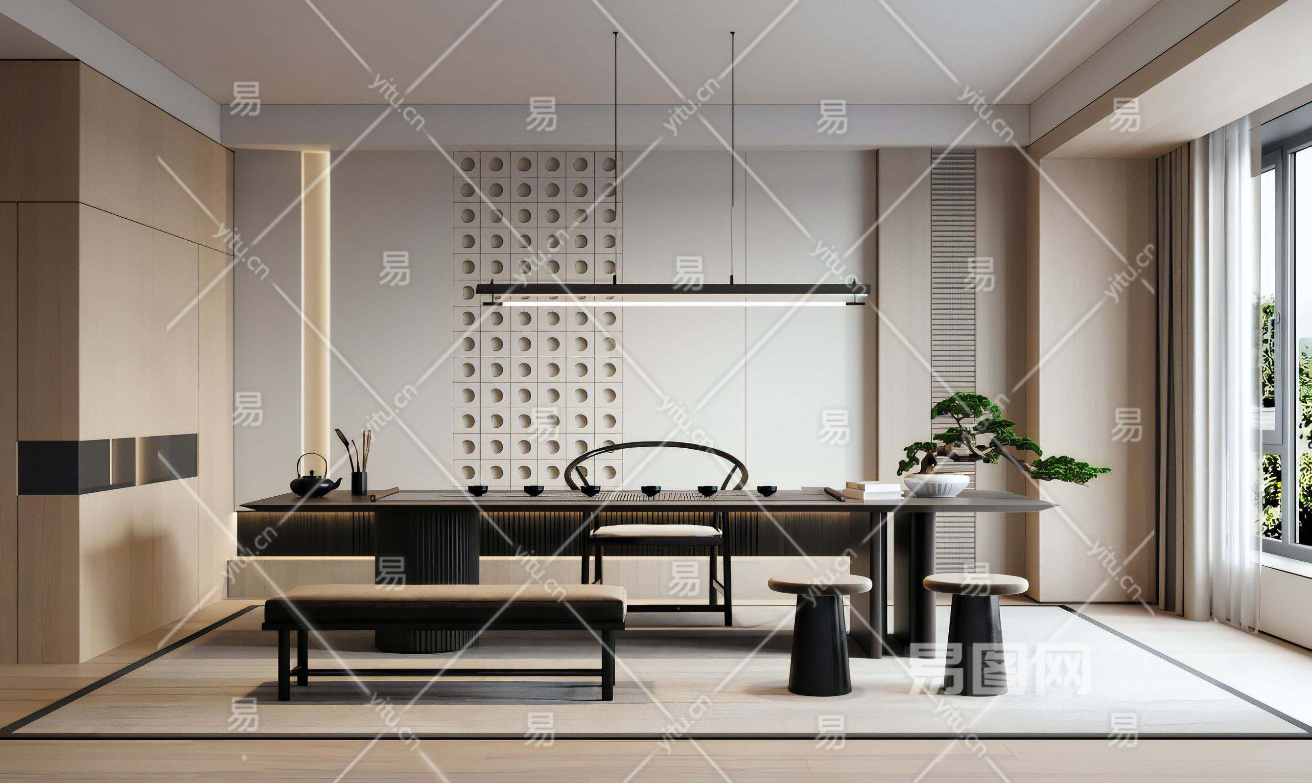 新中式茶室茶桌椅茶台长条吊灯盆景SU模型