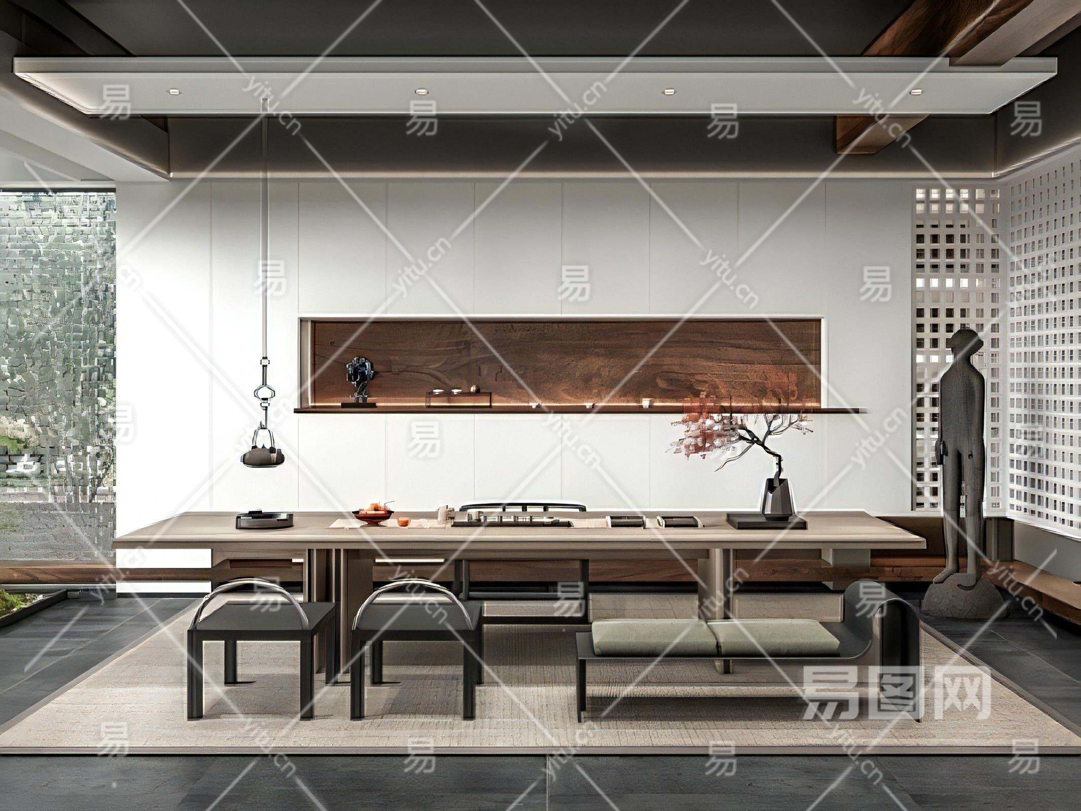 新中式茶室茶桌椅长凳雕塑摆件绿植景观盆栽楼梯间隔断SU模型