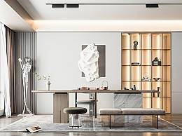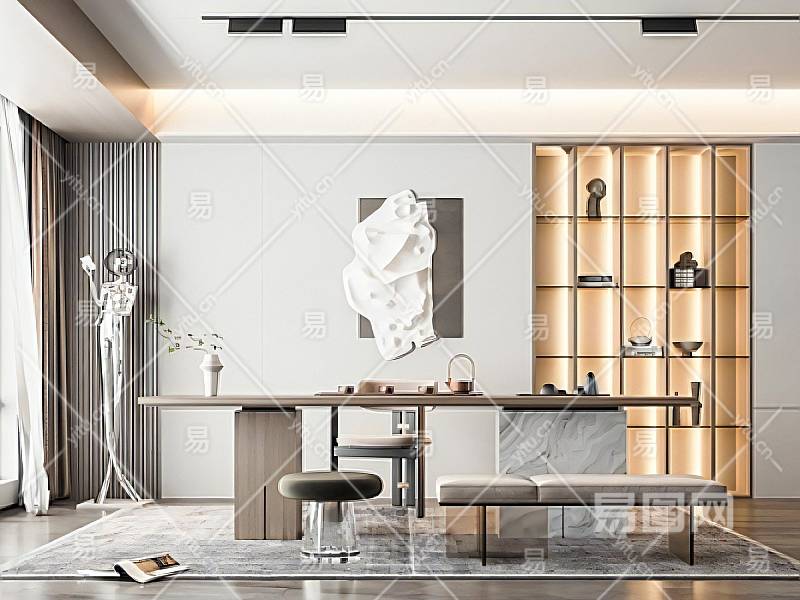现代茶室书房茶桌椅茶凳茶柜吊灯茶台茶具置物架装饰柜SU模型