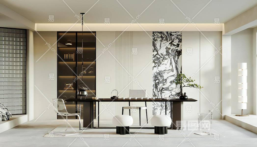 现代茶室茶桌椅茶台圆凳盆景落地灯SU模型