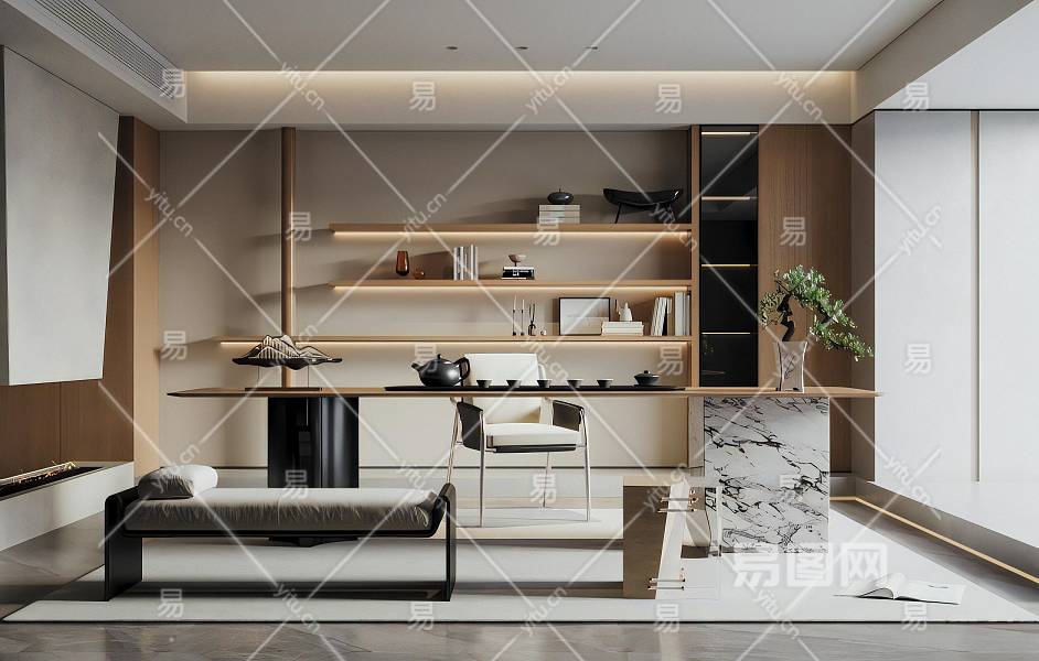 现代茶室茶桌椅茶台盆景茶具SU模型