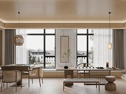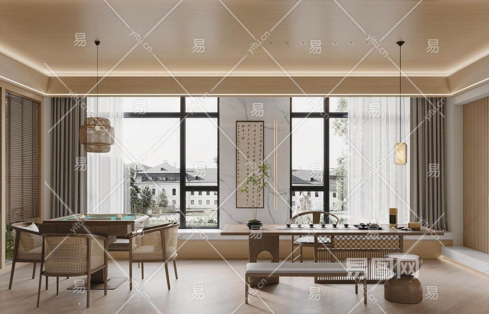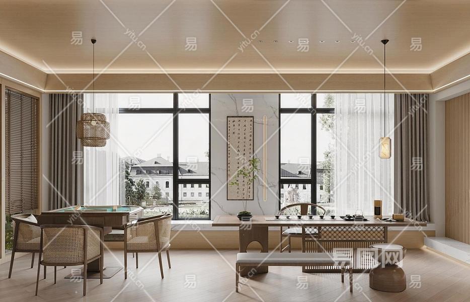 新中式棋牌室 麻将室 茶室 娱乐室 吊灯 长凳 茶具 麻将桌椅