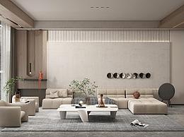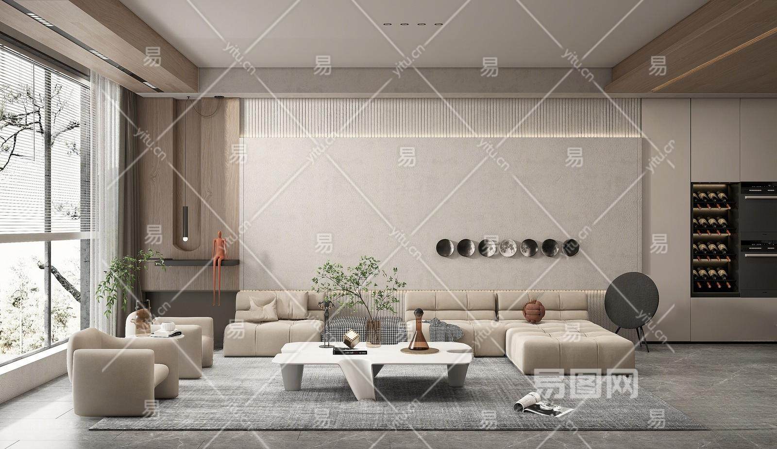 现代大平层客厅 沙发茶几组合 转角沙发 墙饰 酒柜 窗帘