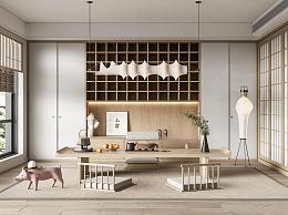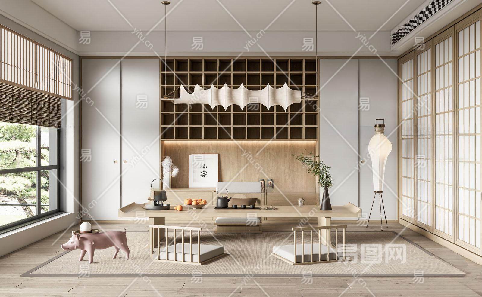 日式榻榻米茶室 茶桌椅 吊灯 落地灯 茶柜