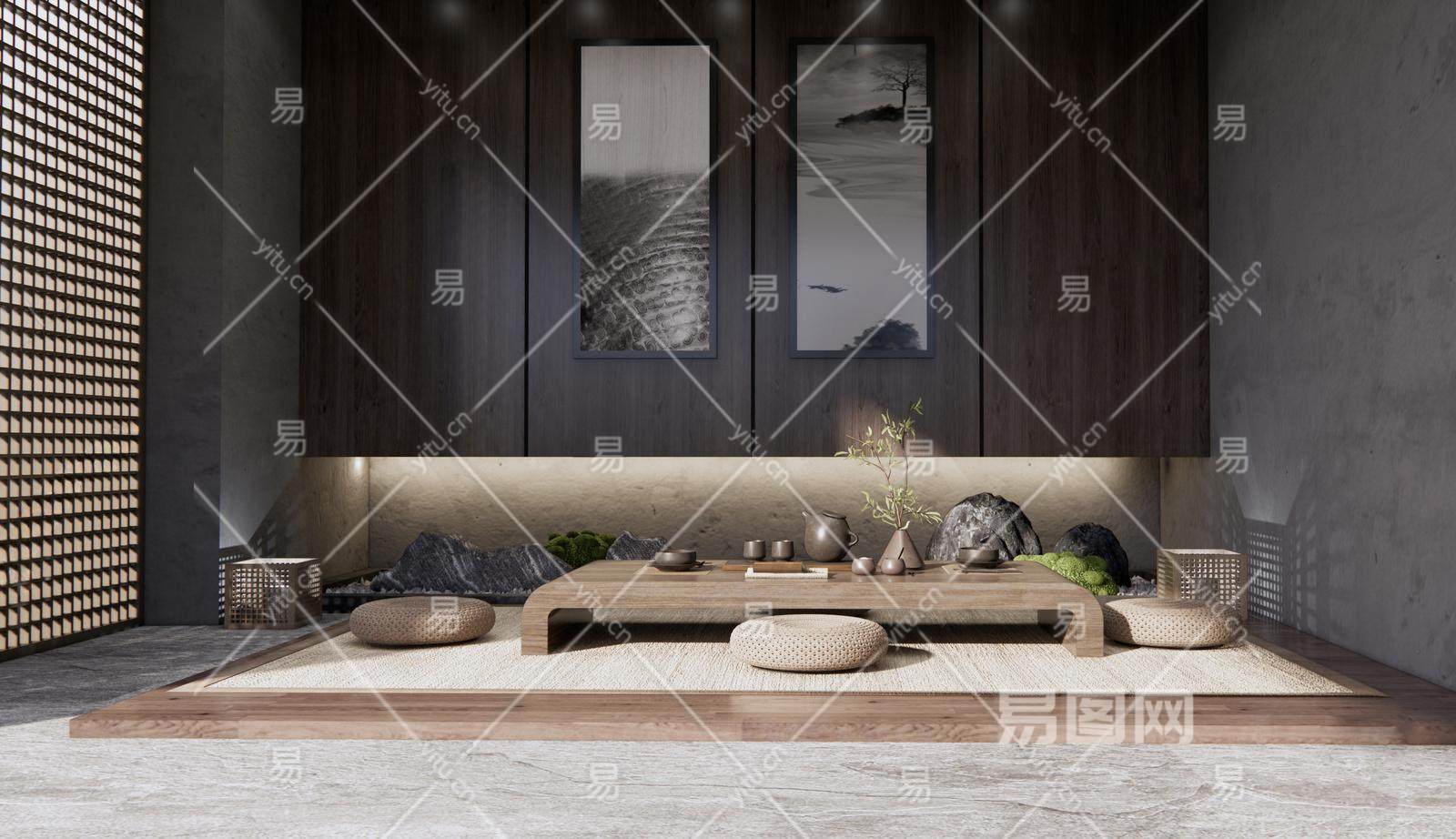 日式榻榻米茶室 茶桌椅 茶台 室内石头景观小品