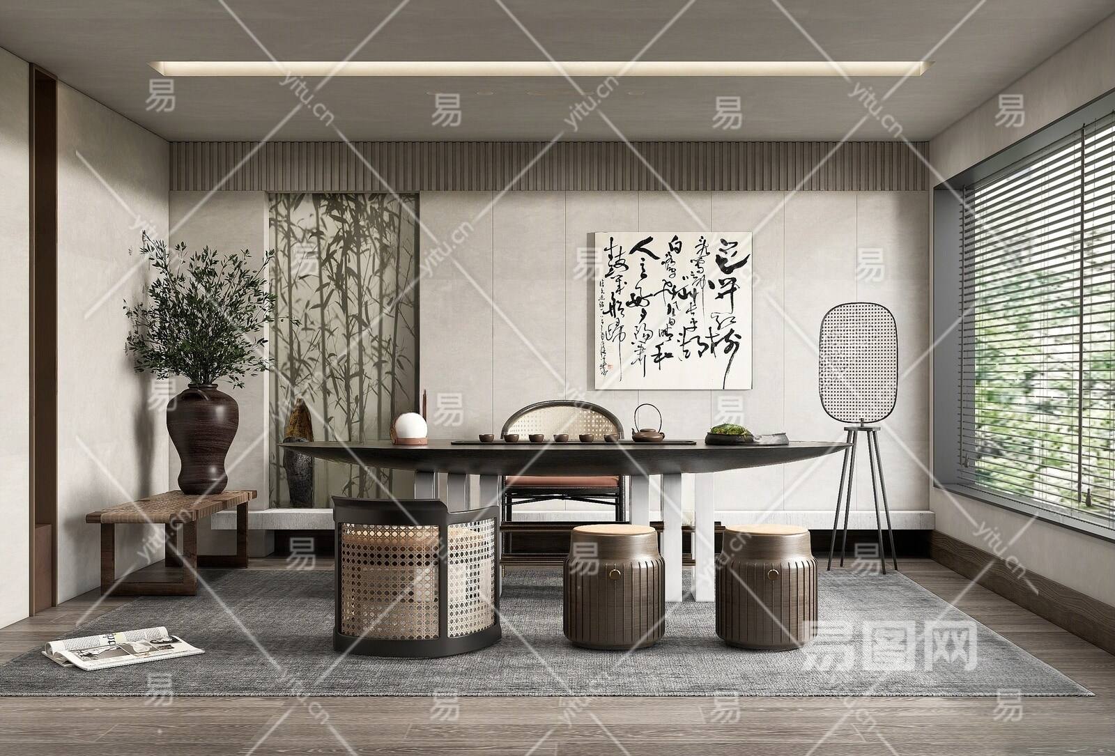 侘寂风茶室 茶桌椅 植物盆栽 落地灯 凳子 墙饰挂画 茶具