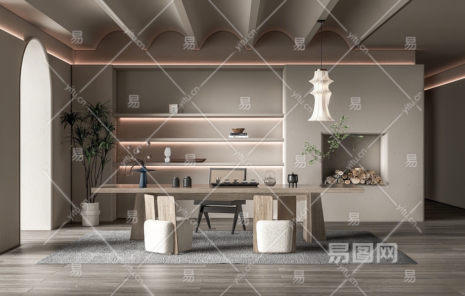 侘寂风茶室 茶桌椅组合 吊灯 绿植盆栽摆件 凳子